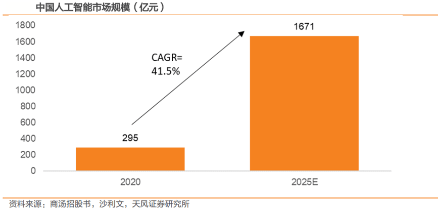 中国是全球人工智能第二大市场,预计增速有望全球第一。根据沙利文的报告,2020年中国人工智能市场规模为295亿元,预计2025年达到1671亿元,年复合增速为41.5%,其中软件市场规模占比将由2020年的9%提升至2025年的24.1%。